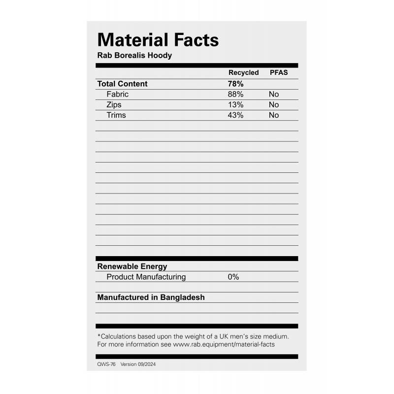 Materiale: 88 % polyamid, 12 % elastan vevd. Matrix™ single-weave stretch-nylon (130 g/m²) med fluorkarbonfri DWR. Passform: Slank. Vekt: 273 g (str. M). Rygglengde: 71,5 cm (str. M).