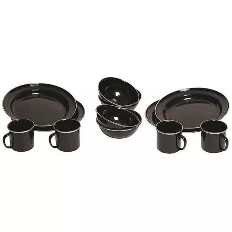 Slitesterkt service i emaljert stål. Består av 12 deler: 4 skåler, 4 kopper og 4 asjetter